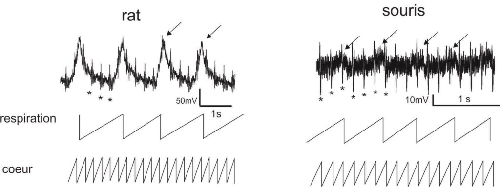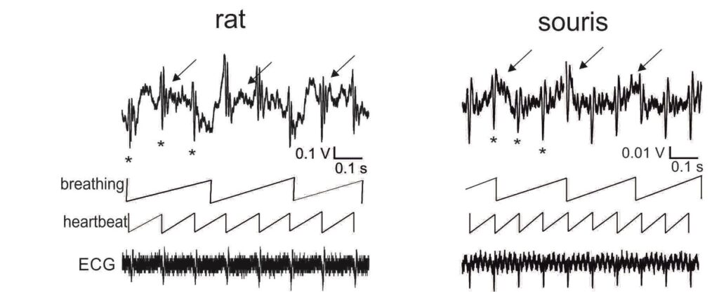 Signal de respiration et battements cardiaques au repos chez le rat (à gauche) et la souris (à droite)