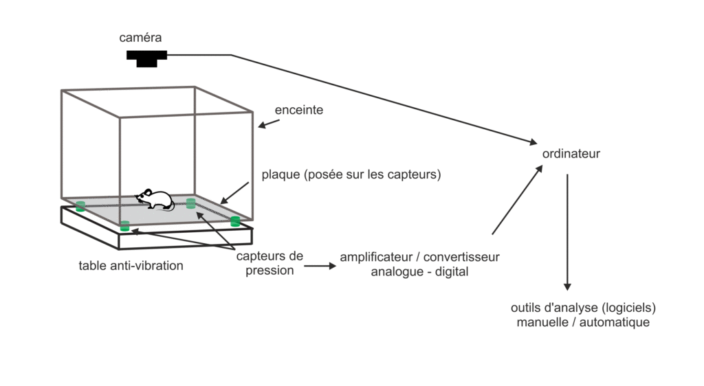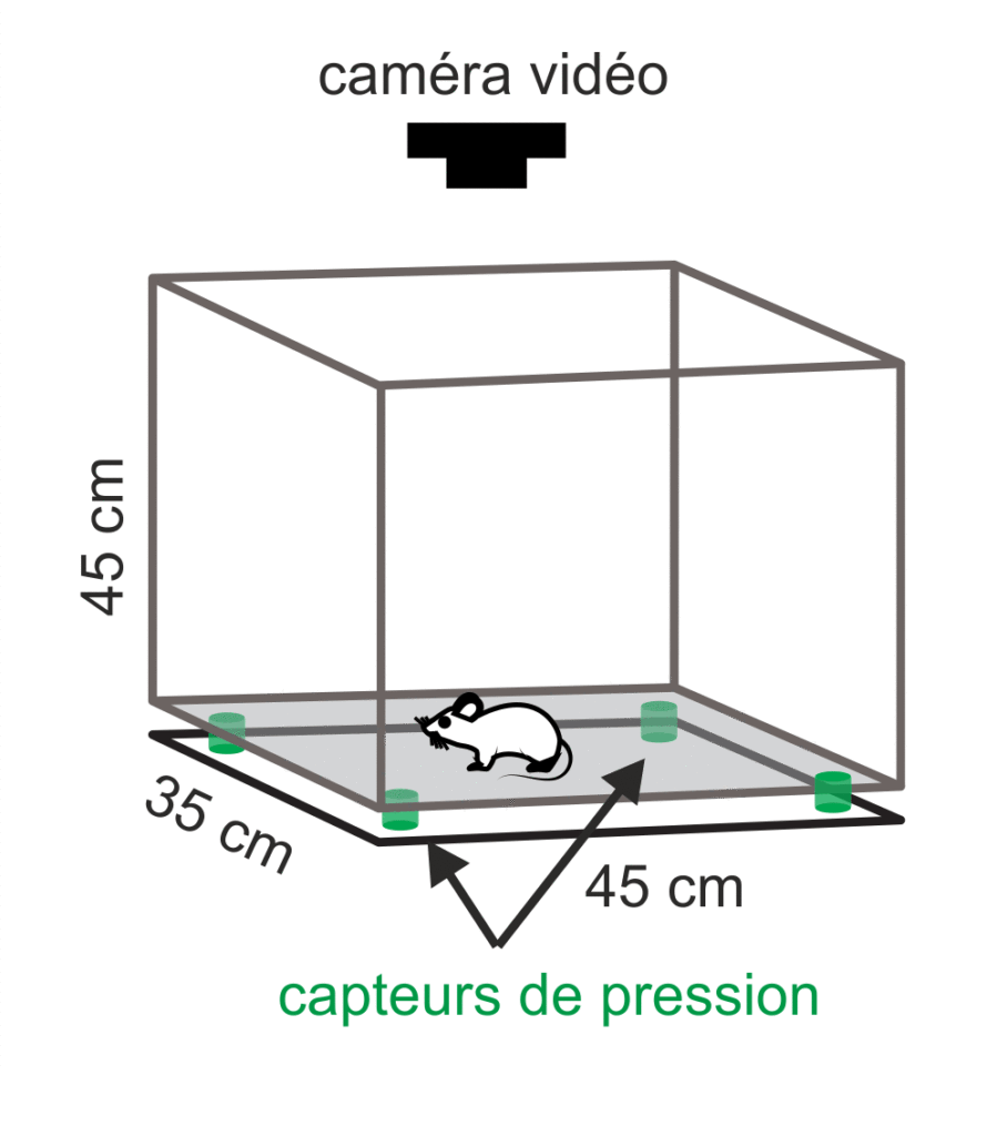 L’animal se déplace librement sur une plateforme (open field, ici 35×45 cm pour la souris), posée sur des capteurs de pression ultra-sensibles.